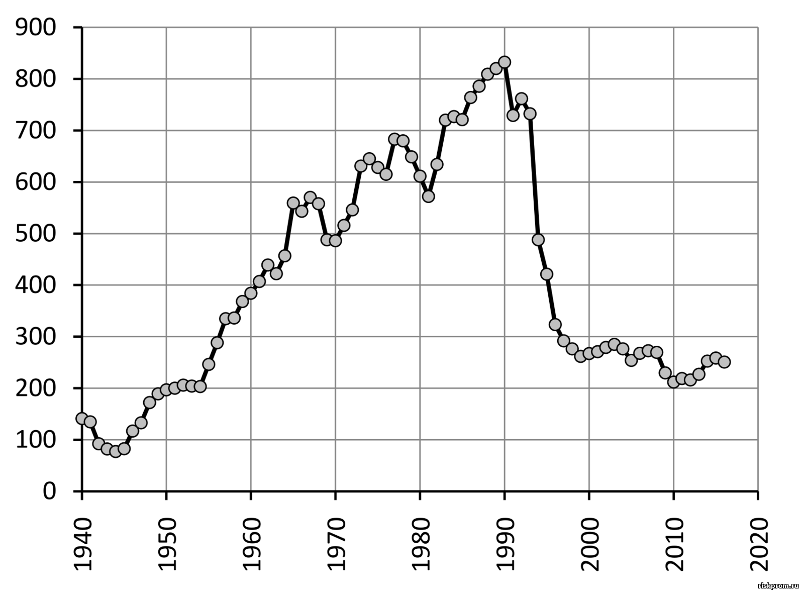 Развитие, начиная с 1960-х годов, современной пищевой промышленности дало возможность перерабатывать значительную часть молока в ценные цельномолочные продукты питания. Набор этих продуктов в РСФСР был весьма широк, цены доступны, и это позволило разнообразить и улучшить структуру массового питания. Вследствие того, что спрос на молочные продукты был всегда высок, при ликвидации планового хозяйства и либерализации цен именно эти продукты подорожали более всего и стали недоступны для большой части населения. В результате на первом же этапе рыночной реформы массовое производство цельномолочных продуктов было свернуто. Оно стало выходить на стабильный режим лишь в 1995-1996 гг., но и в последние 5 лет остается на уровне производства в 1,7 раза ниже, чем в последние 5 лет существования советской экономической системы (Рис. 2- 4). За 1991-2016 гг. с рынков были вытеснены более 300 млн т отечественной цельномолочной продукции, что эквивалентно 25 годам ее производства в объемах 2016 г. Рис. 2- 4. Производство цельномолочной продукции в РСФСР и РФ