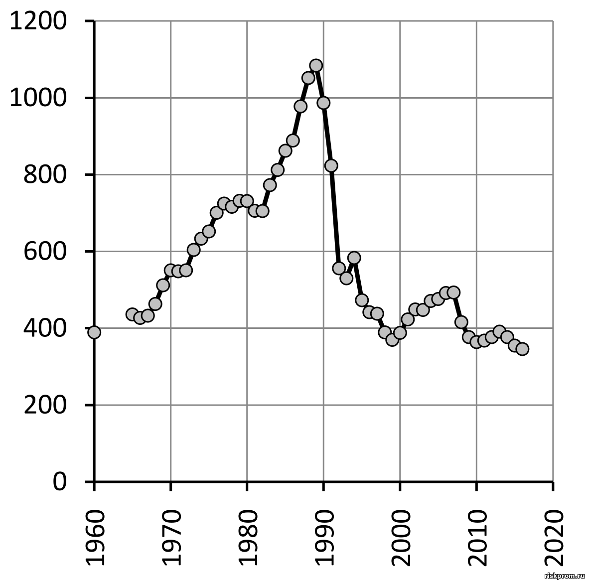 В реформы значительно выросли розничные продажи сыра, они стали опережать объемы производства и компенсируются импортом. Если в 1989-1990 гг. объем розничных продаж сыра в целом соответствовал уровню отечественного производства, то уже в 2000 г. разрыв увеличился в 1,5 раза (т.е. производится в 1,5 раза меньше, чем продается). В 2005 г. разрыв между производством и продажами сыра составлял 1,8 раза, в 2010 г. – 2 раза, в 2013 г. – 2,5 раза, в 2015 г. – 1,6 раза. Высококачественные цельномолочные продукты занимают теперь существенное место лишь в питании благополучной части населения Российской Федерации. Импортные поставки улучшаются: 2000 г. было установлены ненадлежащее качество и (или) опасность 36,4% импортной цельномолочной продукции, в 2005 г. – 5,3%, в 2010 г. – 3,9%, в 2015 г. – 3%. Для сравнения, в 1987 г. госинспекциями системы Минторга РСФСР было забраковано 3,2% молока и молочных продуктов от общего объема выборочно проверенного товара. В ходе реформы спад потребления молока и молочных продуктов происходил неравномерно, так что одни регионы оказались затронуты им гораздо сильнее, чем другие. Например, Приморский край испытал очень глубокий спад потребления – с 1990 г. по 1999 г. в 3,6 раза, в последние годы это положение выправляется. В 2000 г. потребление молока и молочных продуктов в Приморском крае было в 2,6 раза ниже, чем в среднем по России, в 2005 г – в 2,1 раза, в 2010-2012 гг. – в 1,6-1,7 раза, и только в 2015-2016 гг. – в соответствии со среднероссийским уровнем. Из широкого набора потребляемых в РСФСР и Российской Федерации молочных продуктов особо выделим животное масло (сливочное и, в меньшей степени, топленое). В традиционной структуре питания в России масло всегда занимало важное место как ценный продукт, уровень потребления которого многое говорил о благосостоянии семьи. Уже в 1970-е годы в РСФСР был достигнут высокий и устойчивый уровень потребления масла, и оно как столовый продукт практически вытеснило маргарин. Дальнейшее повышение уровня жизни в 1980-е годы повлекло за собой значительный рост производства животного масла (Рис. 2- 7). В результате радикальной реформы уже начиная с 1990 г. наблюдался резкий спад производства. Рис. 2- 7. Производство животного масла в РСФСР и РФ, тыс. т