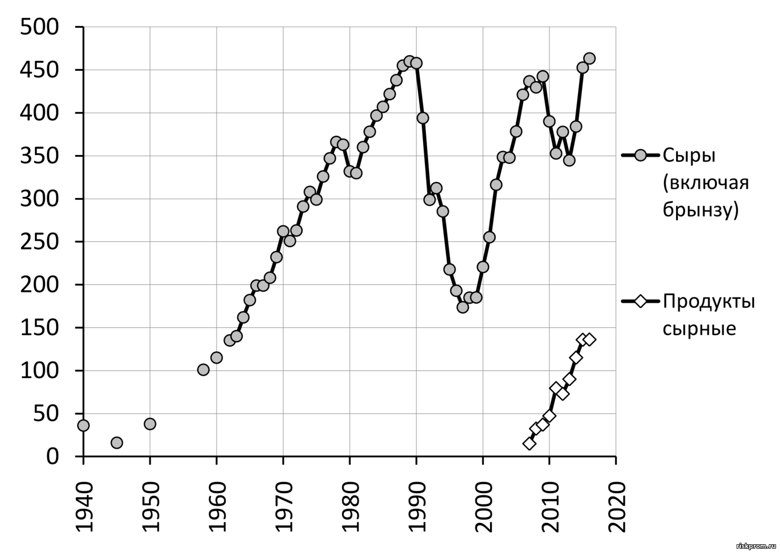 На фоне спада поступления сырого молока в промышленную переработку создано новое масштабное производство йогурта[8] и продуктов сырных: в 2010-х гг. их выпуск соответственно составлял четверть всех кисломолочных продуктов и 20% всех сыров. ____________________ [8] Согласно определению терминологического ГОСТ Р 51917-2002, йогурт – это «кисломолочный продукт с повышенным содержанием сухих обезжиренных веществ молока». Характерный штрих – доля импортного сыра в товарных ресурсах составляла в 1996 г. 55%, в 2005 г. – 46,5%, в 2010 г. – 47,5%, в 2013 г. – 48%, в 2016 г. – 23%. Отечественное производство сыров жирных (включая брынзу) за 1990-1997 гг. сначала сократилось в 2,6 раза (в 1990 г. – 458 тыс. т), а затем выросло к 2009 г. до 443 тыс. т (Рис. 2- 6). С середины 2000-х гг. начался бурный рост производства сырных продуктов. В 2016 г. в РФ было произведено уже 600 тыс. т молокосодержащей продукции номенклатуры «сыры и продукты сырные», из них 136,3 тыс. т - «продукты сырные» (Рис. 2- 6). Рис. 2- 6. Производство сыров и сырных продуктов в РСФСР и РФ, тыс. т