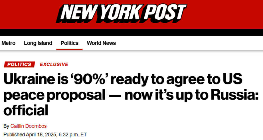 18 апреля New York Post - Эксклюзив: Министр обороны Украины сообщил американским чиновникам, что Киев «на 90%» поддерживает мирную инициативу президента Трампа, представленную в Париже на этой неделе госсекретарем Марко Рубио и двумя специальными посланниками, призванными положить конфликту, сообщил The Post в пятницу высокопоставленный представитель администрации.