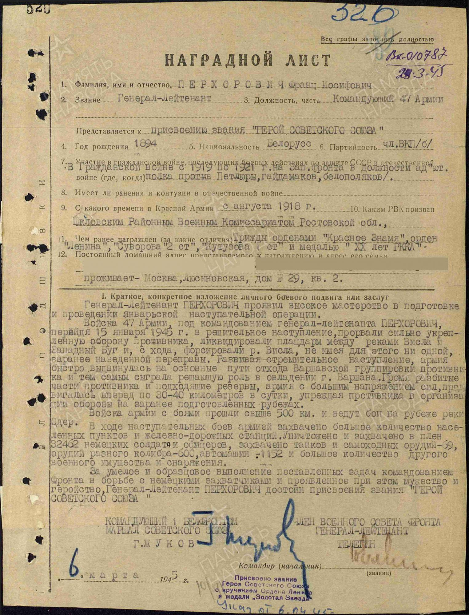 Ф.И. Перхорович блестяще проявил себя в ходе Варшавско-Познанской наступательной операции. 17 января 1945 г. Варшава была освобождена совместными усилиями 47-й, 61-й общевойсковых советских армий и 1-й армии Войска Польского. За умелое руководство войсками и успешные действия в ходе боёв за Варшаву Перхорович 27 января 1945 г. был произведён в генерал-лейтенанты, а 6 апреля 1945 г. удостоен высокого звания Героя Советского Союза.
