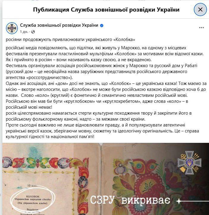 Служба внешней разведки (СВРУ) Украины обвинила Россию в присвоении Колобка и назвала его украинским сказочным персонажем.