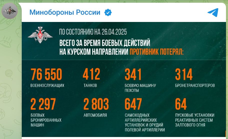 Всего за время боевых действий на Курском направлении ВСУ потеряли: