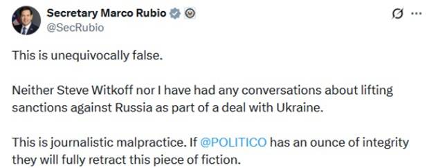 Виткофф не сделал никаких заявлений и не опубликовал твит о своей встрече в Кремле. Однако госсекретарь Марко Рубио написал в Твиттере непосредственно перед встречей, что "разговоров об отмене санкций против России в рамках сделки с Украиной не было".