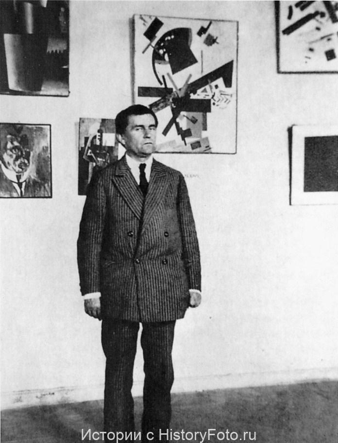 Казимир Северинович Малевич — русский и советский художник-авангардист польского происхождения, педагог, теоретик искусства, философ. Основоположник супрематизма - одного из крупнейших направлений абстракционизма. Казимир Малевич у своих работ в Музее художественной культуры. Петроград, СССР. 1924 год.