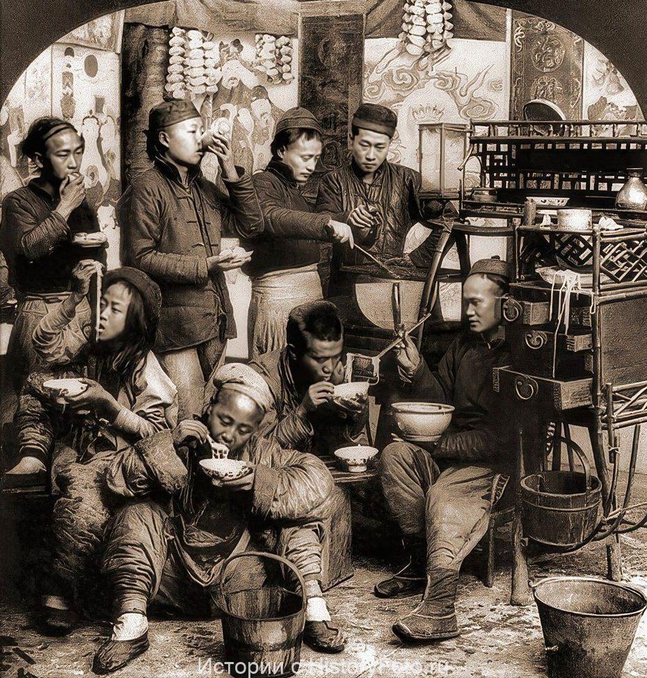 Китайцы завтракают у передвижной закусочной, Кантон, Китай 1901 год.