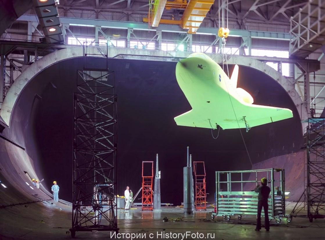 Модель космического челнока НАСА в масштабе 1/3 помещают в испытательную секцию аэродинамической трубы размером 40 на 80 футов Исследовательского центра Эймса в 1975 году. Первый орбитальный запуск челнока состоится в апреле 1981 года.