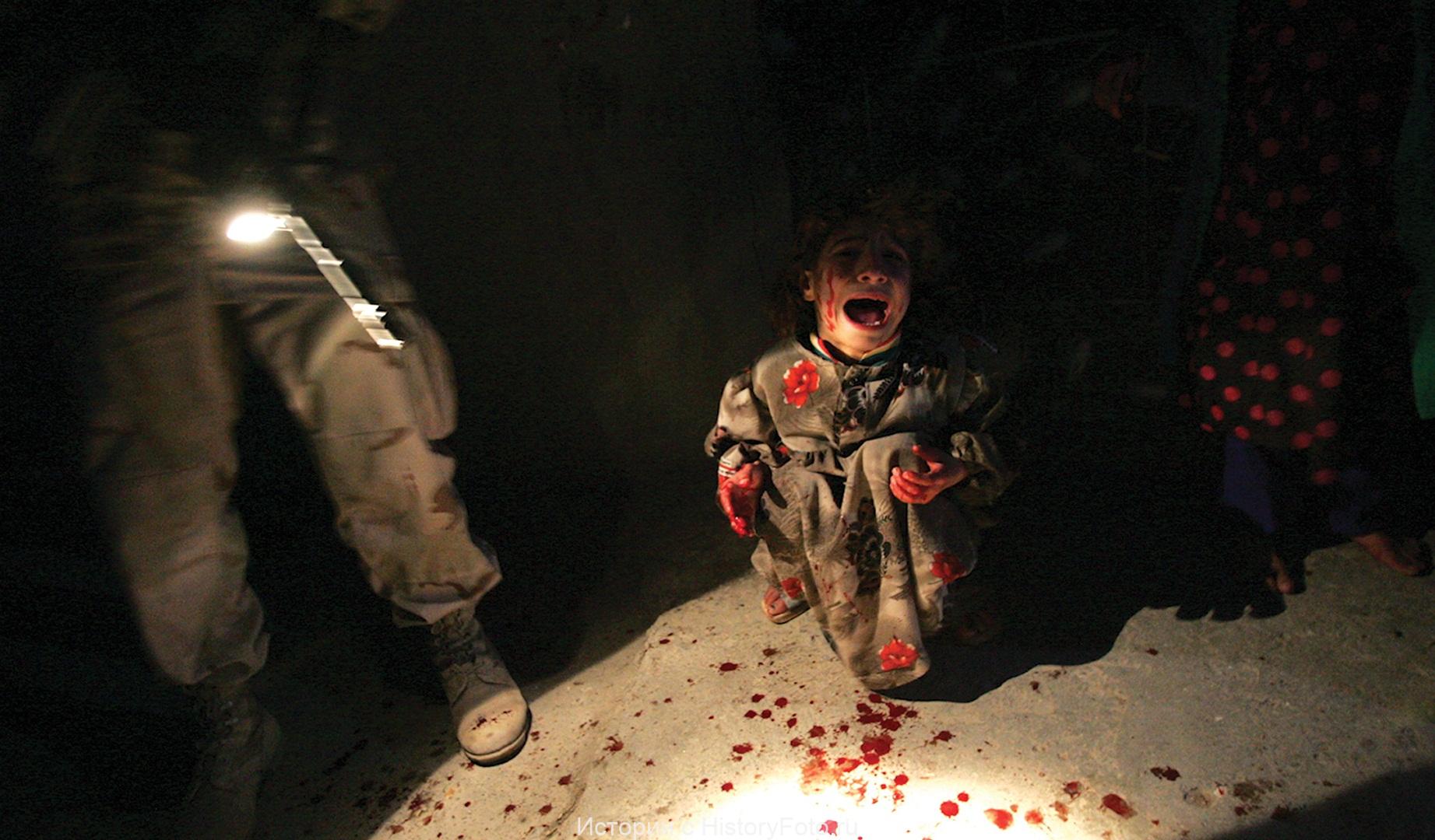 На снимке, сделанном фотографом Крисом Хондросом, пятилетняя девочка Самар Хассан в ужасе кричит после того, как американские солдаты из 25-й пехотной дивизии убили ее родителей на контрольно-пропускном пункте в городе Таль-Афар. Ирак, 18 января 2005 года.