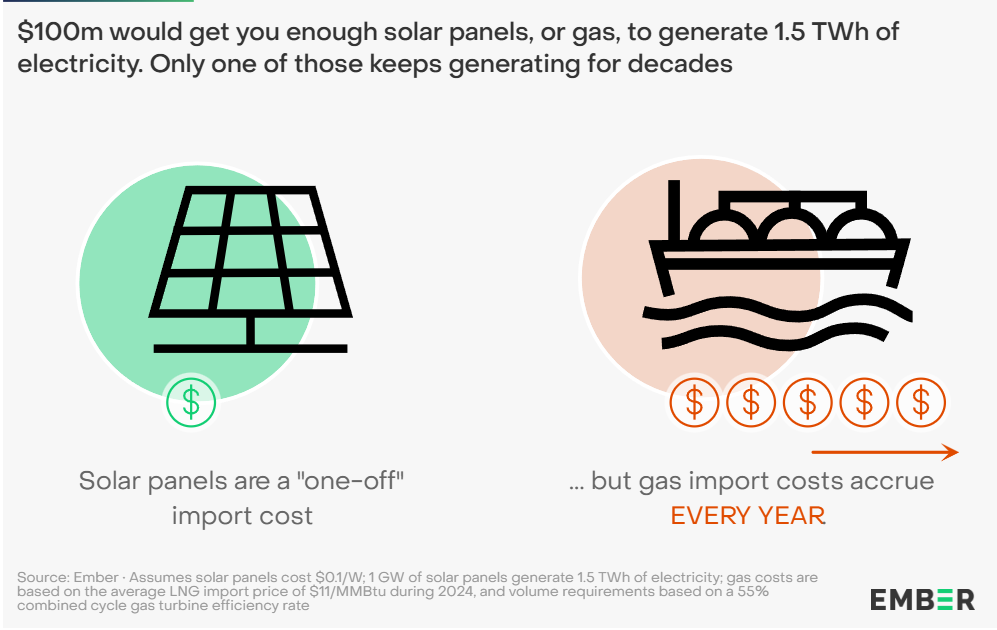 Какой вывод делает Ember: солнечные панели требуют единовременных затрат на импорт, а импорт ископаемого топлива является для стран регулярными расходами, поэтому окупаемость импорта солнечной панели происходит всего за один год! "За 30-летний срок службы солнечных панелей это могло бы привести к экономии, эквивалентной 30 годам расходов на импорт газа по ценам 2024 года"! Ого-го!