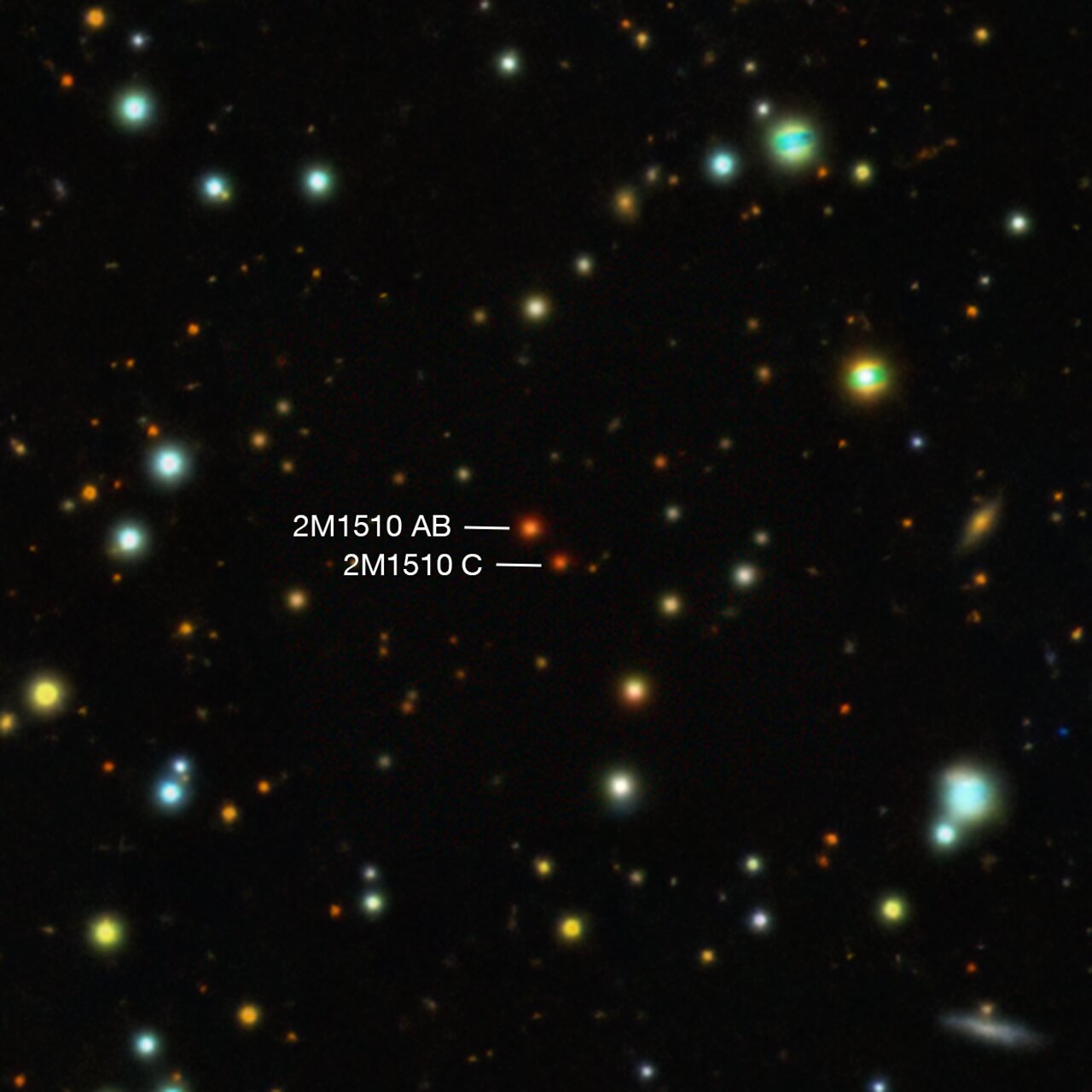 [1] В новом исследовании журнала Science Advances 2M1510 или 2M1510 AB — это названия, данные затменной двойной системе из двух коричневых карликов, 2M1510 A и 2M1510 B. Известно, что в этой же системе есть третья звезда, вращающаяся на большом расстоянии от пары, которую авторы исследования называют 2M1510 C. Исследование показывает, что эта третья звезда находится слишком далеко, чтобы вызывать орбитальные возмущения.
