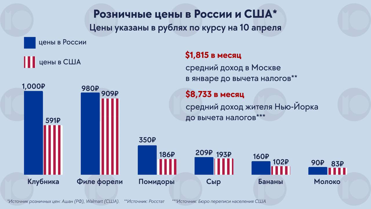 Результаты исследования, проведенного на основе данных Росстата и Бюро переписи населения США, опубликовал канал «4BS | Экономика, бизнес и финансы». Аналитики сравнили средний доход в Москве и Нью-Йорке (до вычета налогов), а также цены в «Ашане» и сети супермаркетов Walmart — они работают примерно в одном сегменте.