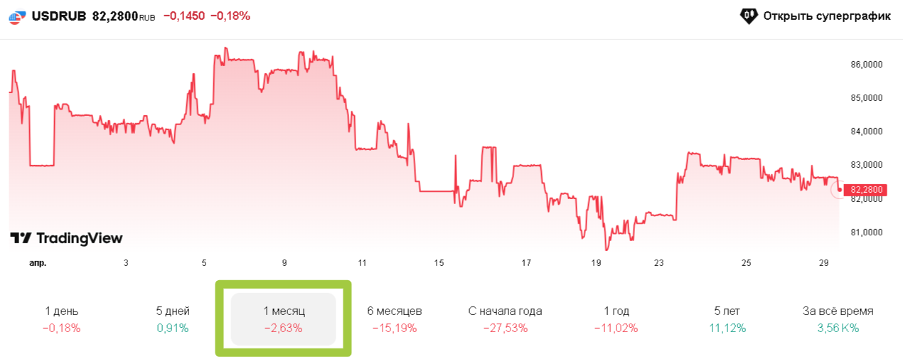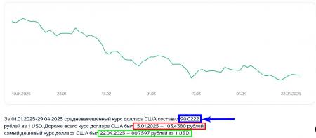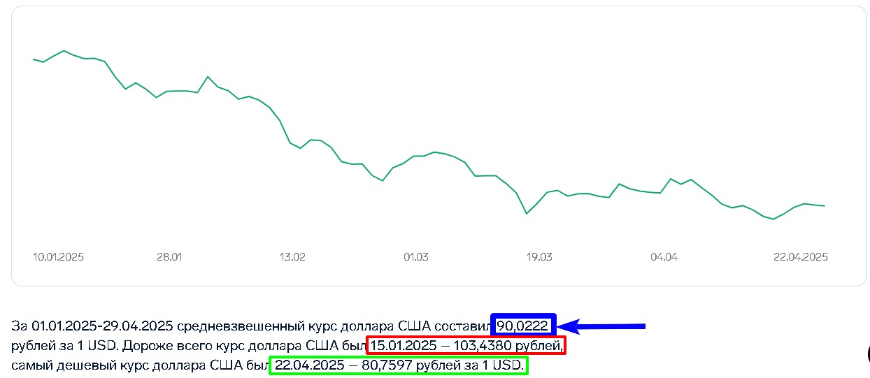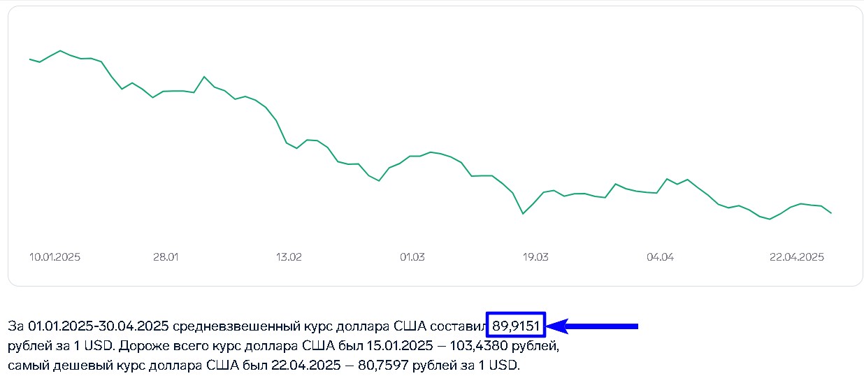 Если принять условное допущение, что рубль продолжит оставаться на уровне 82 рублей к доллару до конца 2025 года, то по итогам каждого дня в который проводятся торги, средневзвешенное значение будет уменьшаться сперва на 8-9 копеек, затем на 7-8 и так далее, делая все менее заметные шаги вниз. То есть через месяц (в конце мая) оно уже могло бы составить примерно 88...87,5 рублей.
