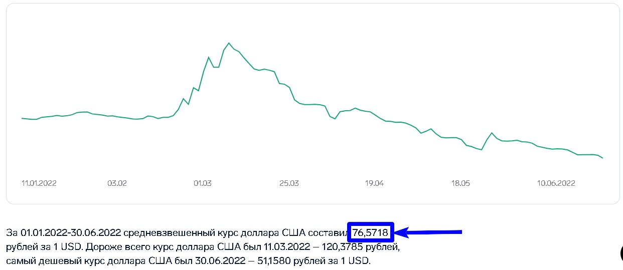 И наконец скрин того самого памятного и триумфального конца июня 2022, когда доллар был "по писят". Как выясняется, среднее значение курса опускалось до 76,57 (был улучшен и перекрыт на тот момент действующий прогноз, первый раз пересчитанный весной-22, он есть в таблице).