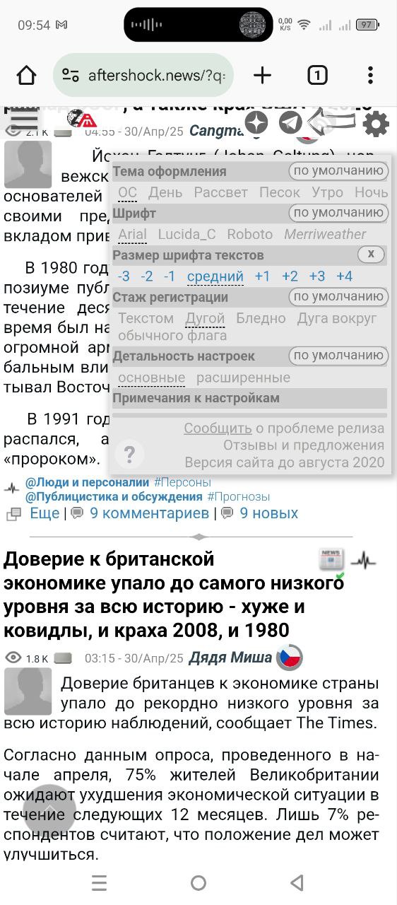 комарад @Коленвал предложил решение. В строчке браузера принудительно добавлять букву m, и тогда открывается мобильная версия сайта - https://m.aftershock.news. Работающее решение, проблему решает.