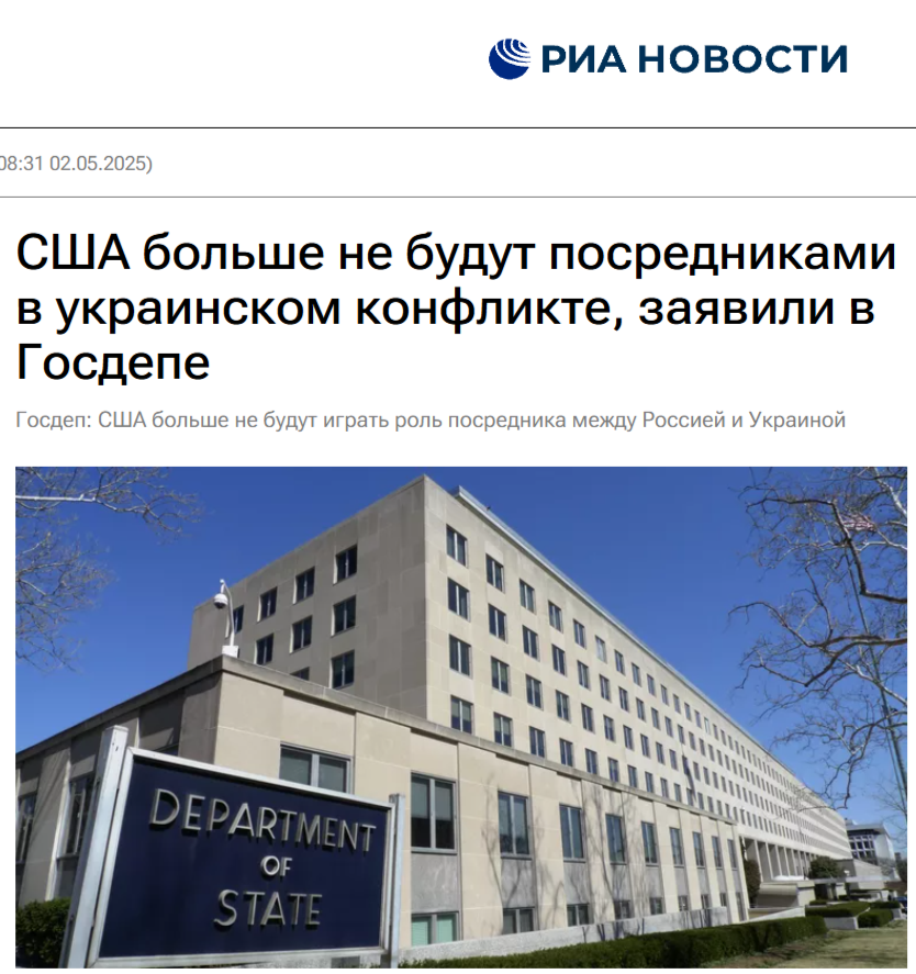 Разберу громкий заголовок в отечественных СМИ: США больше не будут посредниками в украинском конфликте, заявили в Госдепе.