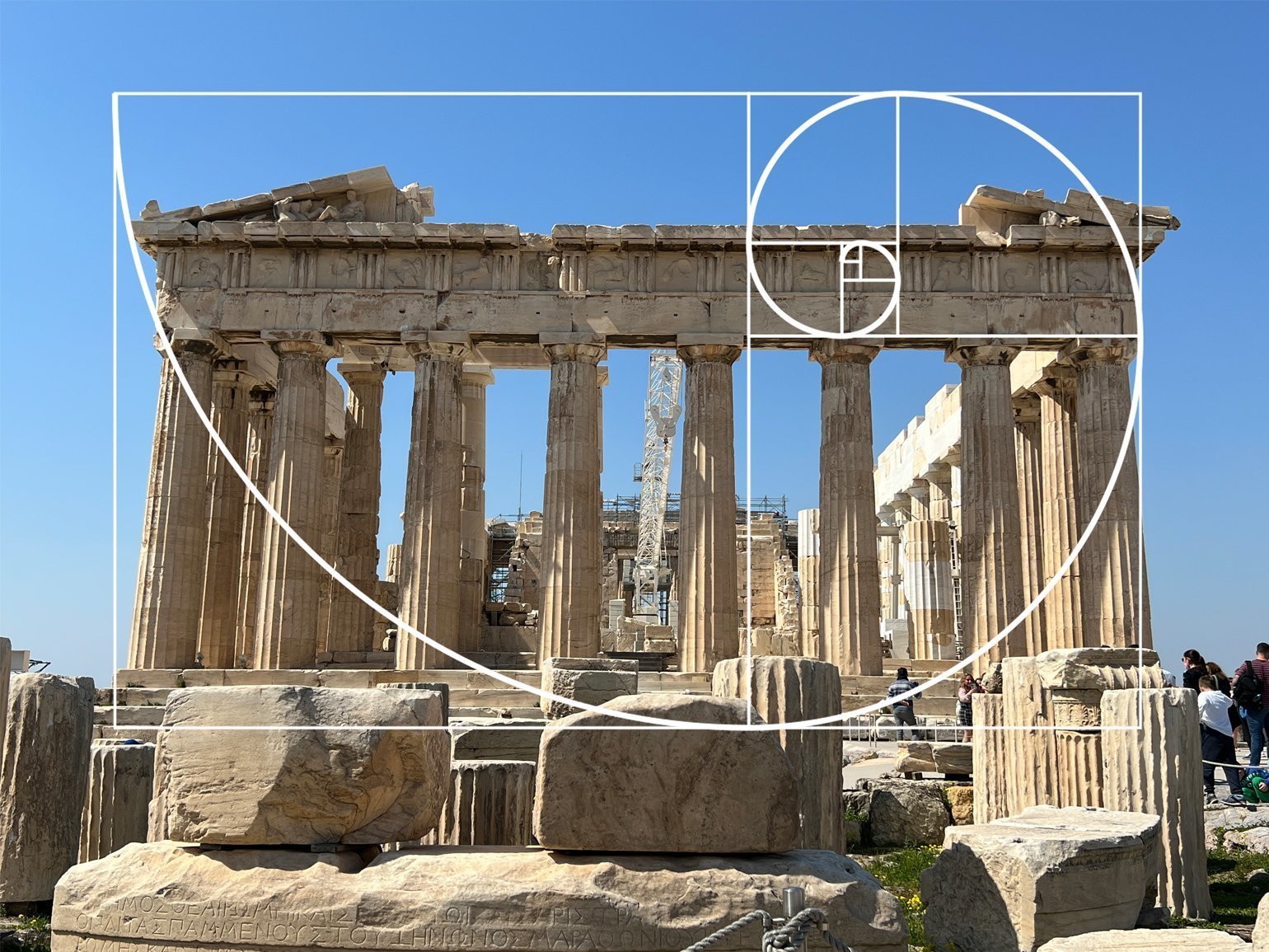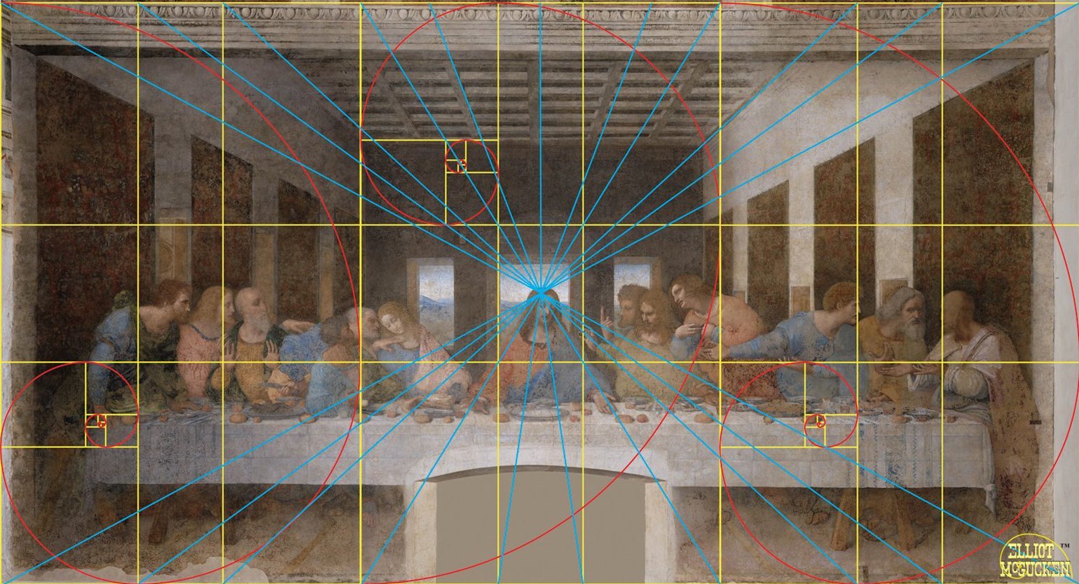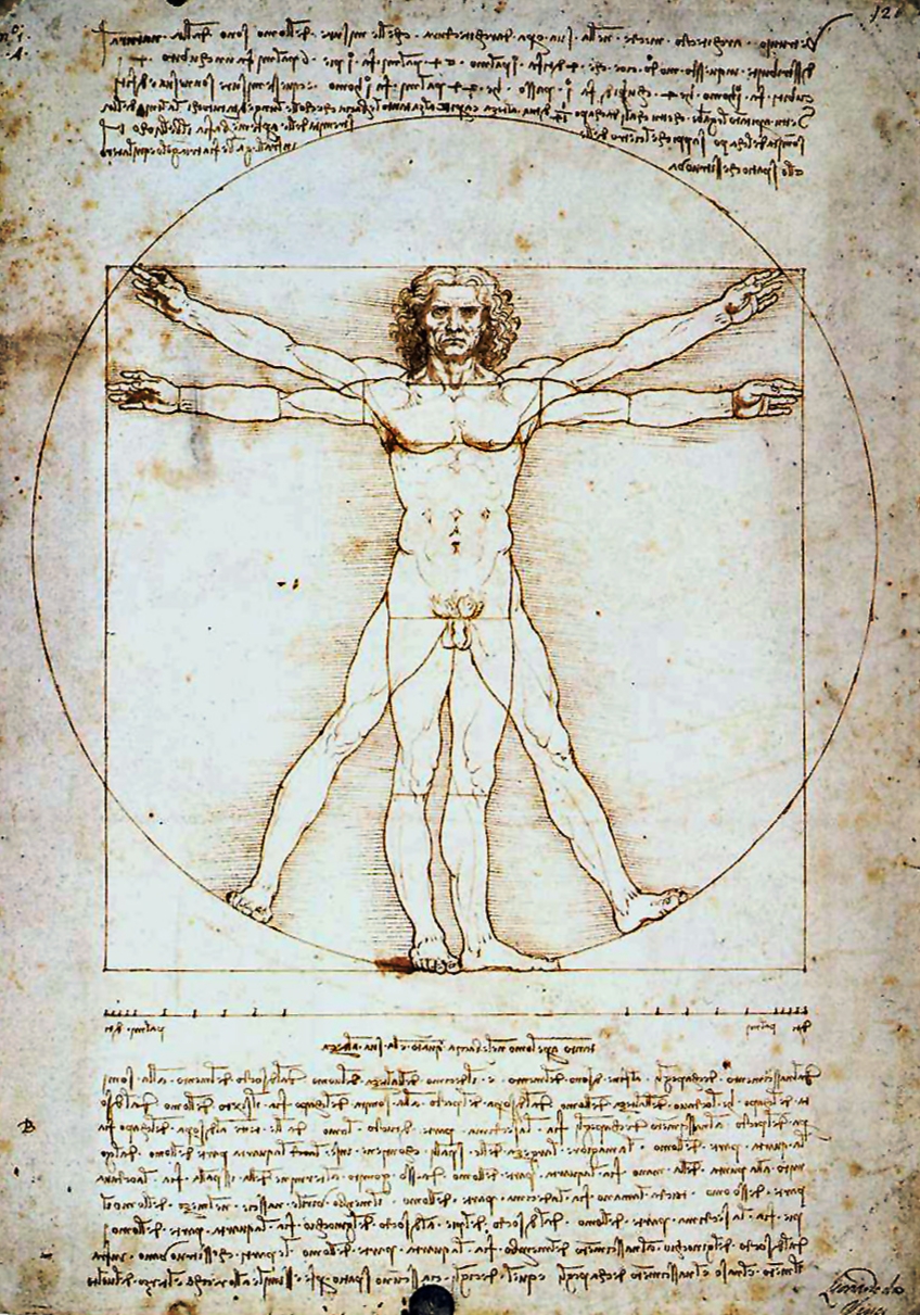 Золотые пропорции человека, «Vitruvian Man». Леонардо да Винчи (1451—1519) вместе с Фра Лука Пачоли (1445—1514), одним из ведущих ученых Ренессанса, были увлечены золотым сечением и вместе написали диссертацию «The Divine Proportion (Божественная пропорция)» , которая была опубликована в Милане в 1509 с иллюстрациями Леонардо. Среди изобилия исследований да Винчи в одном из его журналов Vitruvius's De Architectura есть знаменитый «Vitruvian Man» — изучение пропорций человека. Этот рисунок и сопровождающий текст иногда называют «Canon of Proportions (канон пропорций)» (1492, перо, чернила, акварель, бумага, 34.3 х 24.5 см., Gallerie dell'Academia в Венеции). Леонардо изображает обнаженную мужскую фигуру в двух наложенных положениях с разведенными руками, одновременно вписанную и в круг, и в квадрат. Центр круга, находящийся в пупке, делит тело на большую и меньшую верхнюю часть в золотой пропорции. Вероятно, да Винчи был первым, кто назвал эту пропорцию «золотое сечение» (лат. «sectio aurea»).