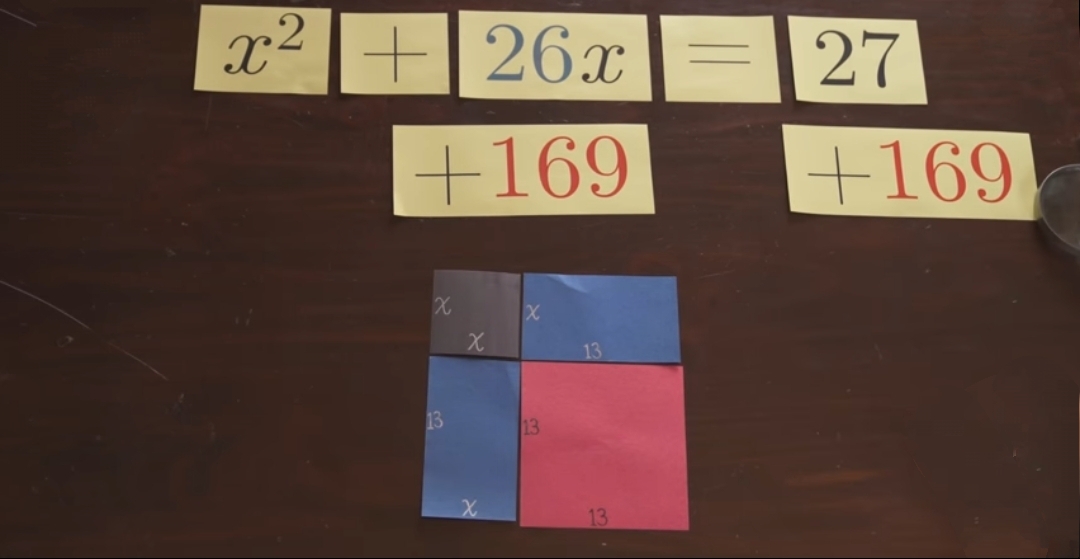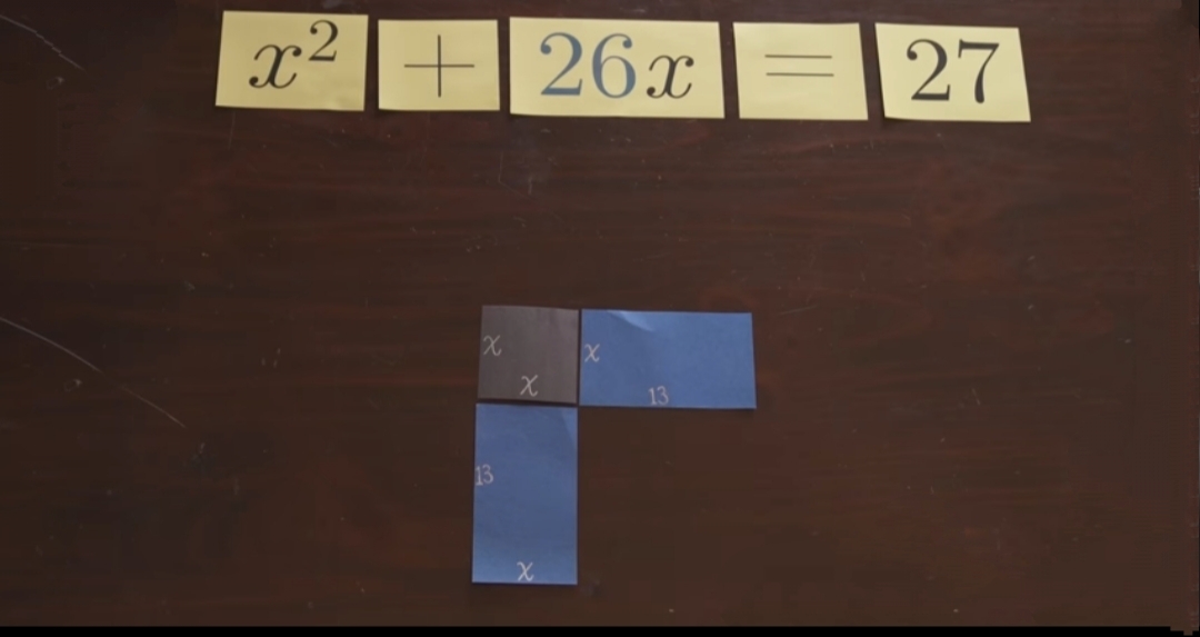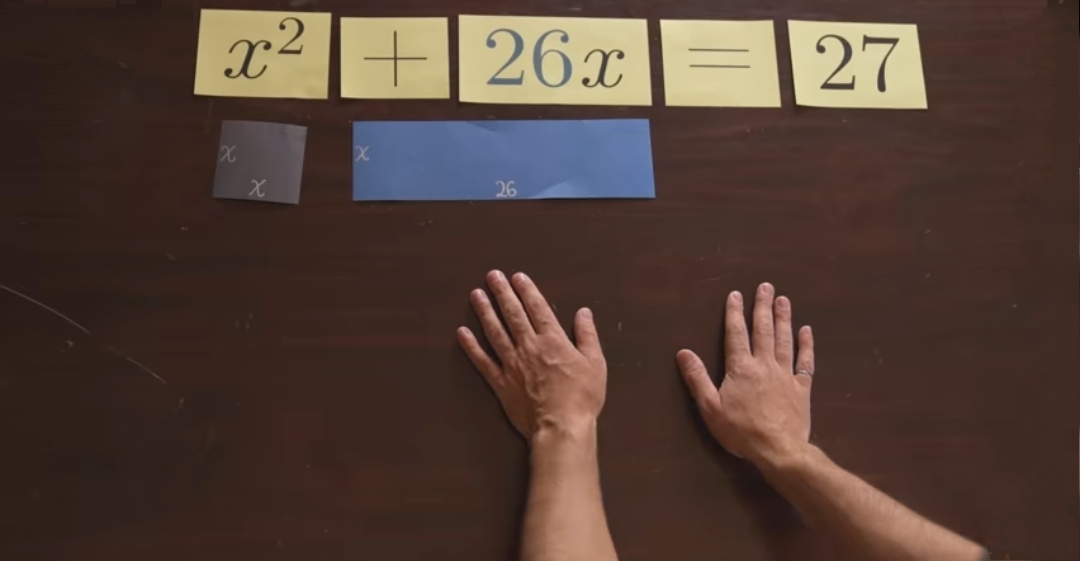 Древние математики представляли бы себе реальный квадрат со стороной «X», а под «26x» они понимали бы прямоугольник с шириной, равной 26, и высотой, равной «X». И согласно уравнению сумма этих площадей равна 27.