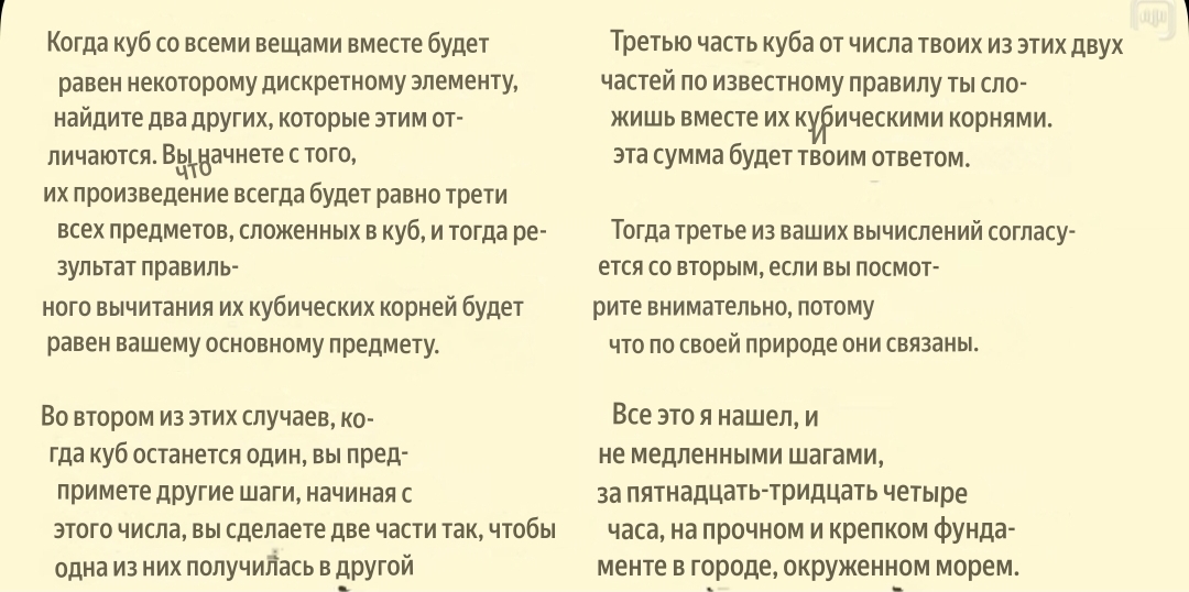 По сути, он создаёт формулу, с помощью которой можно вычислять корни. Но вот что самое интересное: он записывает свой алгоритм не с помощью формул, как это мы делаем сейчас, а в форме стихотворения.