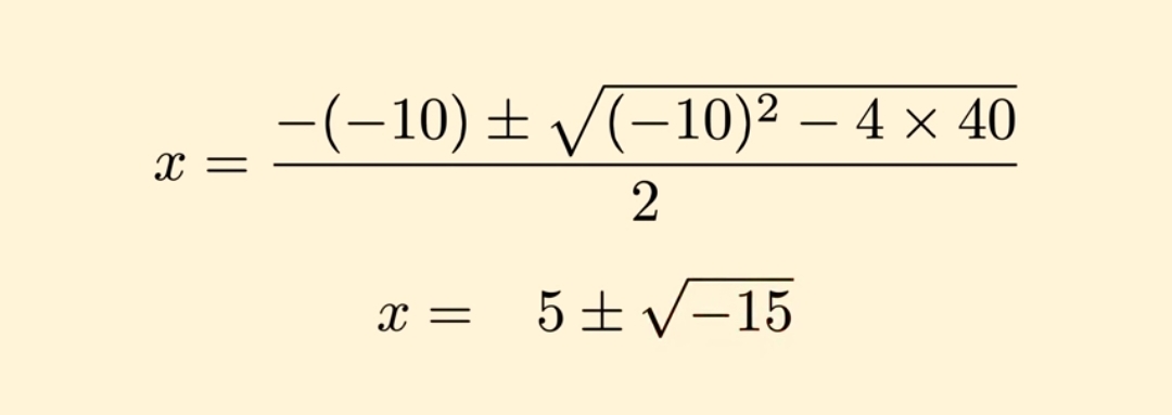 Но оказывается, что это не первый раз, когда появлялся корень из отрицательного числа в математике. На самом деле, ещё в книге «Арс магна» возникает такая задача: нужно найти два числа, которые при сложении равны 10, а при умножении дают 40.
