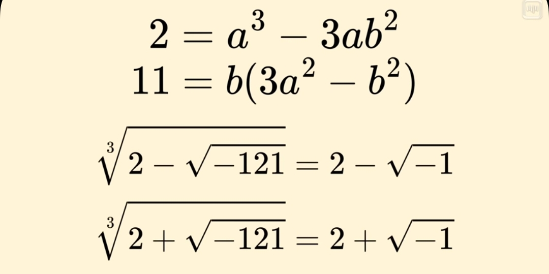 Это выглядит как настоящее чудо! То есть оказывается, что метод Кардано работает, но при этом нужно забыть про геометрическую интерпретацию уравнений и в некотором смысле формально работать с корнями из отрицательных чисел.