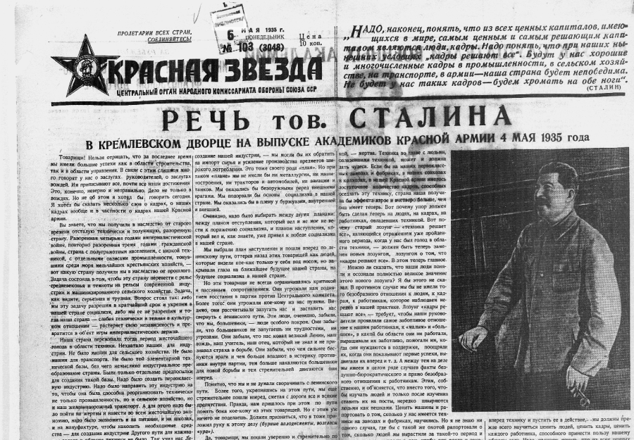 Вот почему упор должен быть сделан теперь на людях, на кадрах, на работниках, овладевших техникой. Вот почему старый лозунг - «техника решает все», являющийся отражением уже пройденного периода, когда у нас был голод в области техники, … должен быть теперь заменен новым лозунгом, лозунгом о том, что «кадры решают все». В этом теперь главное.