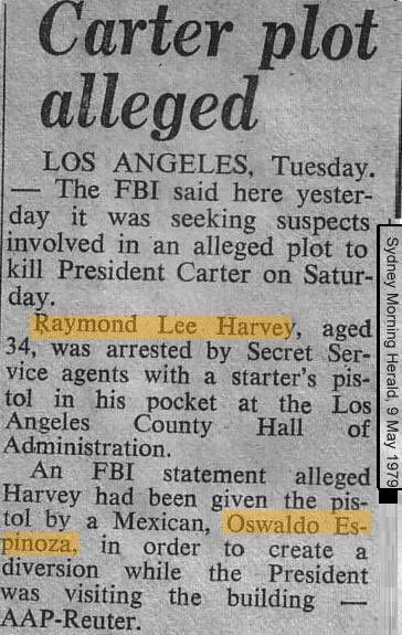 Рэймонд Ли Харви – американский бродяга. Родился в Огайо, был арестован Секретной службой США после того, как у него обнаружили стартовый пистолет с холостыми патронами за десять минут до того, как президент Джимми Картер должен был произнести речь в торговом центре Civic Center Mall в Лос–Анджелесе 5 мая 1979 года. Харви утверждал, что он участвовал в операции по убийству президента в составе четырех человек, после того как к нему обратились трое латиноамериканцев, остановившихся в отеле «Алан», которые дали ему стартовый пистолет и попросили выстрелить из него в землю для отвлечения внимания, чтобы затем застрелить президента из своего номера в отеле. Он провел ночь в номере, снятом одним из мужчин, которого он знал как «Хулио», но который позже был идентифицирован как 21–летний нелегал из Мексики, назвавший имя Освальдо Эспиноза Ортис.