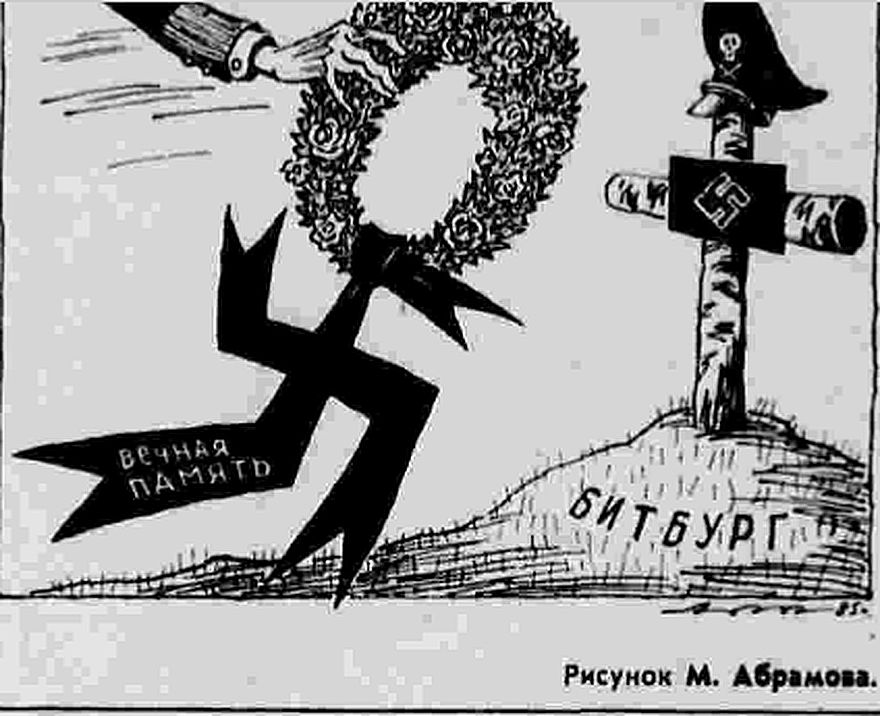 ПРИМЕЧАНИЕ К КАРИКАТУРЕ- (оно было написано под рисунком, который вы видите вверху страницы, а решил его разместить в основном тексте - примечание моё) На кладбище в западногерманском городе Битбург похоронены останки около 2 тысяч солдат гитлеровского вермахта, в том число 49 военнослужащих из известной своими зверствами танковой дивизии СС «Рейх». Именно её головорезы принимали участие в операциях по массовому уничтожению гражданского населении в Советском Союзе. Польше, Италии. Гибель 642 жителей сожжённой французской деревни Орадур также дело их рук. Во время Арденнской операции в Малмади близ Битбурга эсэсовцы учинили резню, жертвами которой стали 84 американских военнопленных. Тогда же ими были казнены 64 канадца и англичанина. Ныне неподалеку от Битбурга расположена база ВВС США. Уже сегодня Пентагон превратил её в огромный склад, где сосредоточена новейшая боевая техника. В скором времени там будут размещены американские крылатые ракеты.