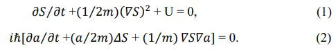 Уравнение (1) интерпретируют, как предельный переход к классическому уравнению Гамильтона-Якоби для действия S. Уравнение (2), игнорируя мнимую единицу, интерпретируют, как уравнение неразрывности. Действительно, выражение в квадратных скобках можно преобразовать к уравнению неразрывности, но голословно отбрасывать i, стоящую перед квадратной скобкой в уравнении (2) – это традиционное пренебрежение физиками мнимой составляющей.
