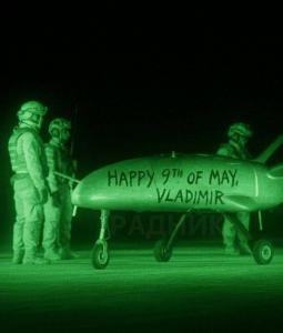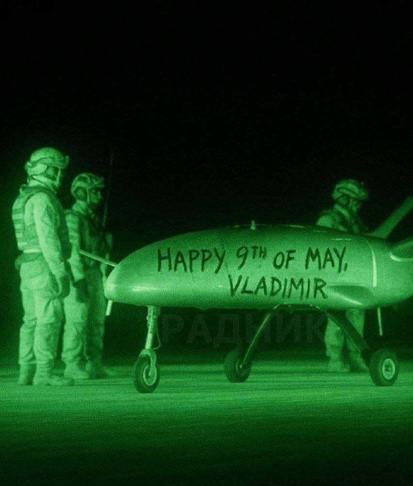 На фото дрон с надписью «HAPPY 9TH OF MAY, VLADIMIR», окружённый военными в полной натовской экипировке. Снимок сделан в зелёном спектре прибора ночного видения. Типичная картинка ночной операции, если бы не одно но: форма поздравления.