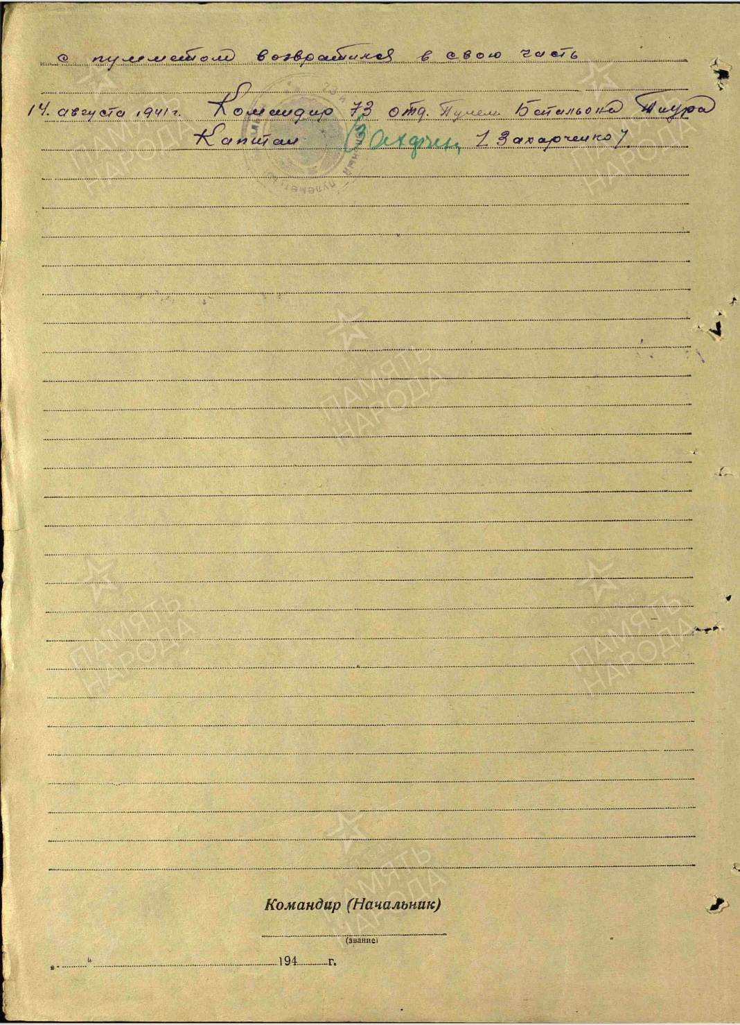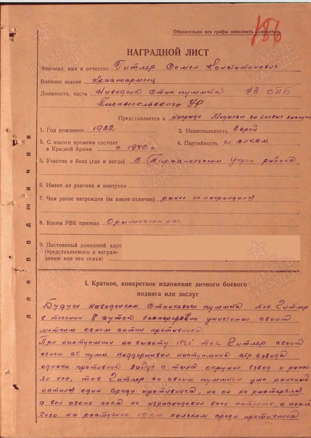 Наградной лист красноармейца Гитлера Семёна Константиновича