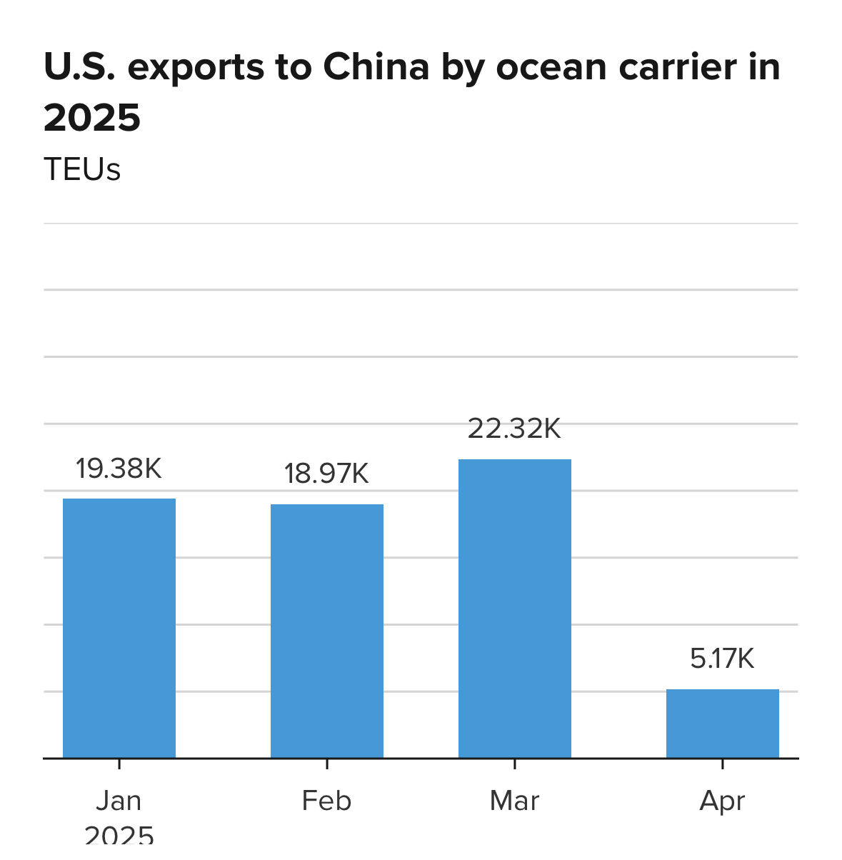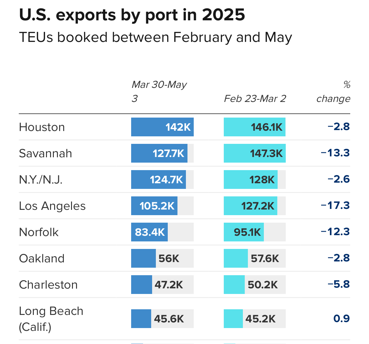 Снижение экспорта связано с уменьшением количества контейнеровозов, прибывающих в США, поскольку предприятия отменяют заказы на производство, а также с изменениями в мировом спросе, связанными с торговой политикой США. Импорт в США продолжает снижаться: портовые данные, отслеживаемые компанией Vizion, показывают падение количества контейнеров на 43 % за неделю с 21 по 28 апреля.