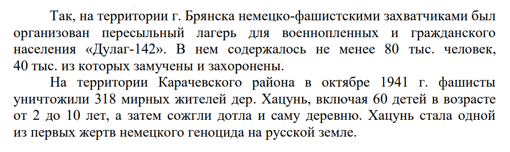 В период 1941–1943 годов на территории Брянской области немецко-фашистскими захватчиками, оккупационными властями и их наймитами путем массовых расстрелов, сожжения заживо, истязания, повешения, а также с использованием развернутой сети концентрационных и пересыльных лагерей преднамеренно истреблено более 74 тыс. мирных граждан, в том числе более 4,5 тыс. детей, свыше 48 тыс. военнопленных, проходящих военную службу в Красной Армии – Вооруженных Силах СССР, насильственно угнано на принудительные работы в Германию и другие страны более 153 тыс. человек. За годы оккупационного режима на Брянщине было уничтожено более тысячи деревень.