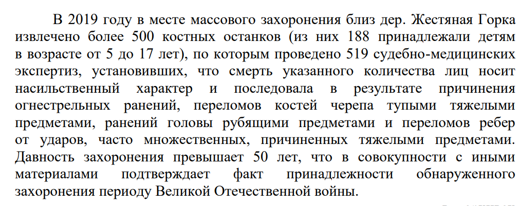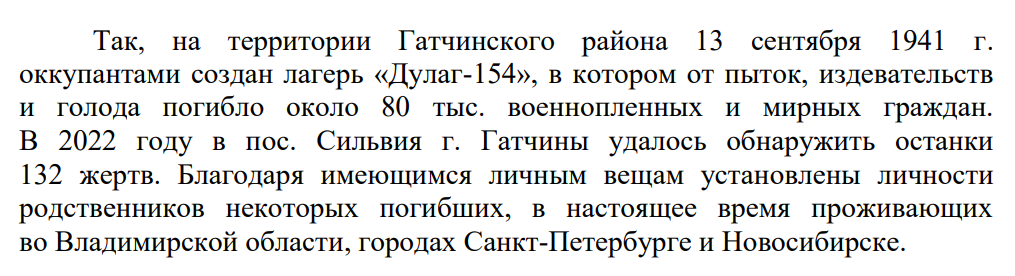 В период с 2020 по 2022 год в Гатчинском, Ломоносовском, Лужском и Тосненском районах области обнаружены ранее неизвестные захоронения, что послужило основанием для возбуждения следственными органами уголовных дел.