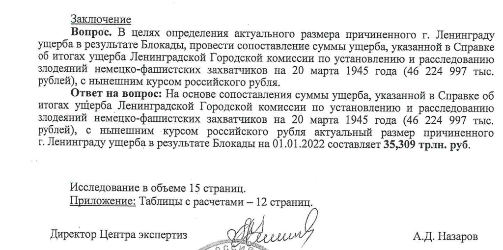 В рамках проверки прокуратуре области удалось установить размер причиненного оккупантами ущерба объектам культурного наследия – более 2,605 млрд. рублей. В перерасчете, произведенном экспертами Санкт-Петербургского государственного университета на основании соотношения курсов рубля, доллара и золота, в настоящее время данная сумма составляет 1,909 трлн. рублей.