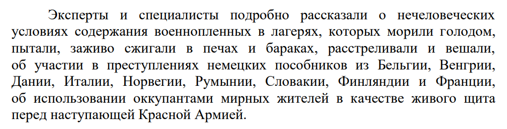 Специалистами подробно освещены преступления по уничтожению более 100 населенных пунктов Крыма, массовые убийства советских граждан в концлагере «Красный» (погибло около 15 тыс. советских граждан), психиатрических больницах г. Симферополя и Белогорского района (умерщвлены в душегубках около 900 пациентов).