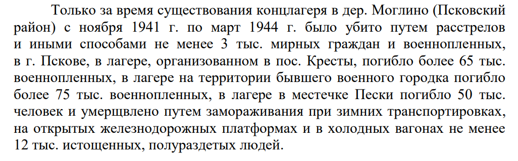За период временной оккупации области немецко-фашистскими захватчиками и их пособниками преднамеренно уничтожено более 75 тыс. мирных советских граждан, в том числе 1,4 тыс. детей, более 377 тыс. военнопленных, проходивших военную службу в Красной Армии – Вооруженных Силах СССР, более 192 тыс. граждан СССР насильственно угнано на принудительные работы в Германию и страны Прибалтики.