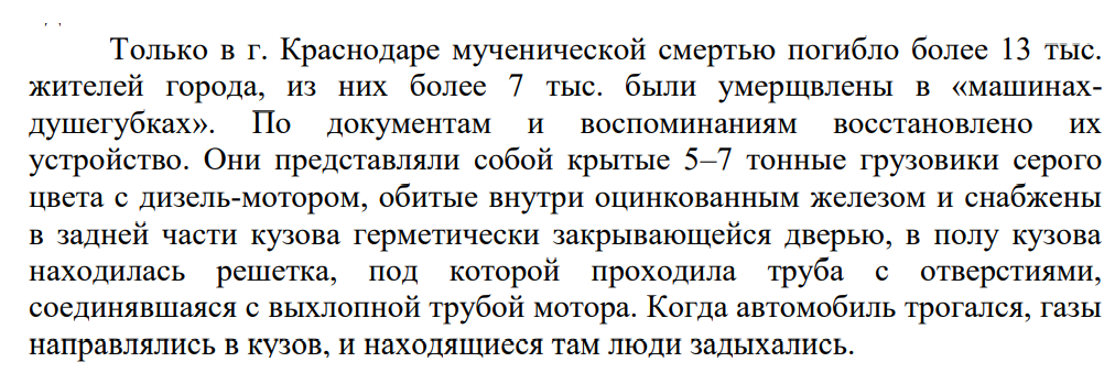 В период оккупации Кубани немецкими оккупационными властями и их пособниками путем расстрелов, истязаний, пыток, повешения, отравления газом, сожжения заживо и иными способами, а также с использованием развернутой сети концентрационных лагерей и лагерей трудовой повинности преднамеренно истреблено более 48 тыс. мирных граждан, в том числе более 9 тыс. детей, свыше 9 тыс. военнопленных, насильственно угнано на принудительные работы в Германию и другие страны более 129 тыс. человек.