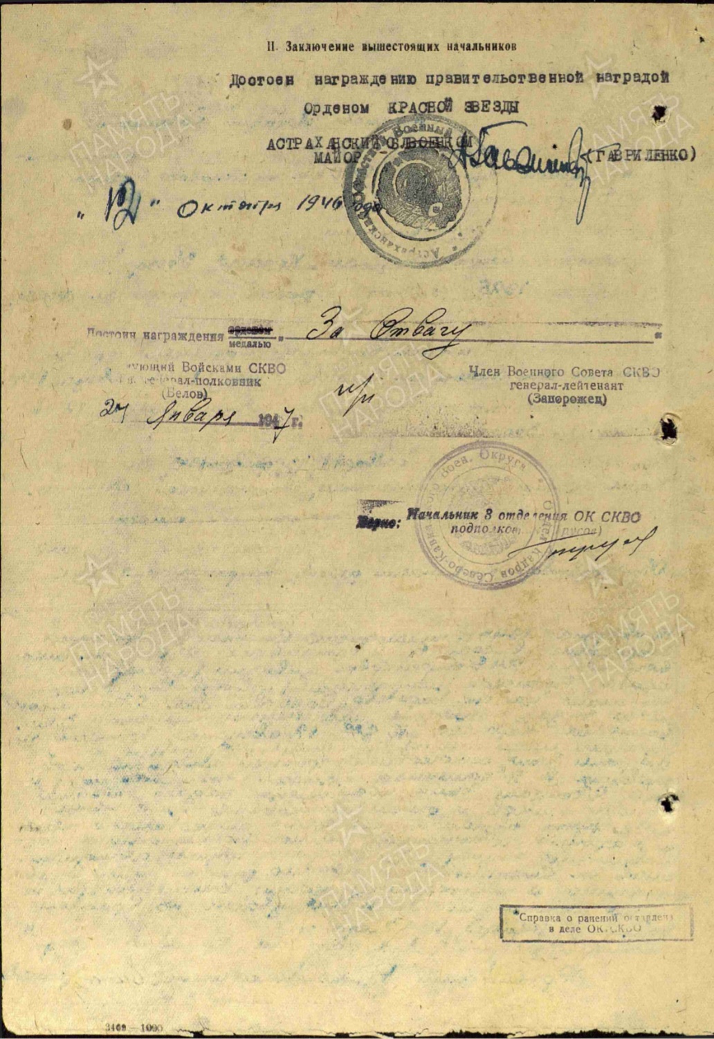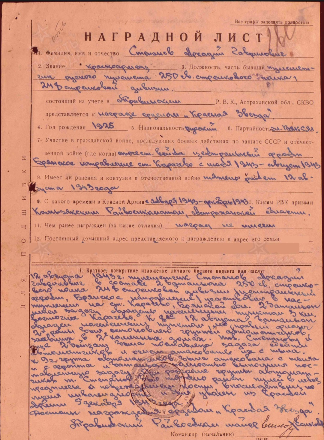 Медаль «За Отвагу» Аркадий Гаврилович получил в августе 1943 года на Брянском направлении. Батальон астраханца участвовал в операции по освобождению населённого пункта Карачево. Вместе со своими сослуживцами он атаковал противника, сидевшего в засаде, миномётным огнём с тыла и выполнил боевое задание. Рубеж был взят! А Аркадий Степанов был тяжело ранен в том бою. Пуля попала в левое предплечье с глубоким повреждением кости. 18-тилетний парнишка в одночасье стал инвалидом.