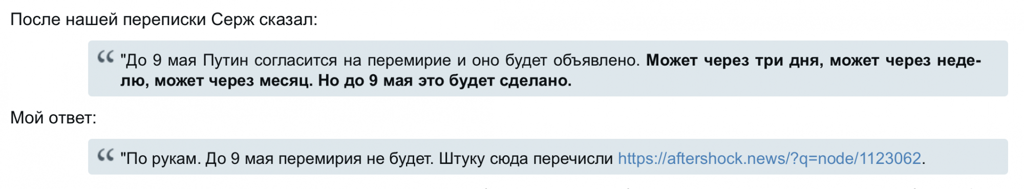 "По рукам. До 9 мая перемирия не будет. Штуку сюда перечисли https://aftershock.news/?q=node/1123062.