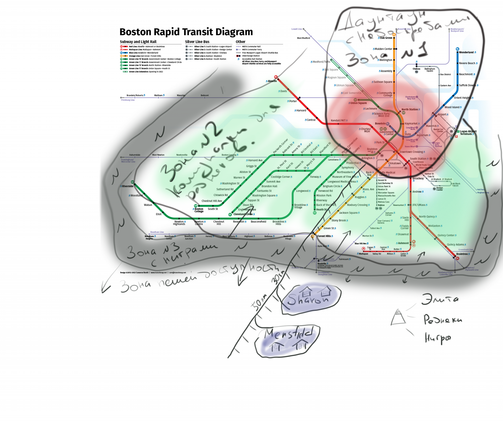 Когда они начали здесь селиться, стоимость недвижимости упала практически до нуля, то есть произошёл исход белого американского населения в эту зону. И сюда также (стрелки на север и на юг от черной зоны). У Бостона есть бостонская область, в бостонской области есть посёлки, эти посёлки соединены с городом автомагистралями. Здесь посёлок называется, например, Шерон. Здесь жил мой коллега Витя с Украины, который строил здесь дом на продажу, который стал для меня примером, и я взял его способ и сейчас строю дома на продажу в Курске. Я ездил как в Шэрон к Вите в гости, так и к начальнику. По выходным мы у него работали на его участке, он мне продолжал платить. В будние дни мы делали шабашки в городе, а по выходным я шабашил на его участке. Город и деревни соединены автомагистралью. На горизонте были небоскрёбы. Они ехали вот на такой автомагистрали к центру. И также город и эти деревни соединены с городом железной дорогой. Я ездил по железной дороге, 15 долларов туда-обратно билет стоил. Это очень много, если ты зарабатываешь 100 баксов в день. 15 баксов мне отдавать было тяжело, я прятался от кондукторов в туалете. Один раз меня высадили на предпоследней станции железной дороги, от метро, и я шёл через негритянский квартал ночью, было страшновато. Но так как я одет в строительную одежду, ко мне никто даже не подошёл.