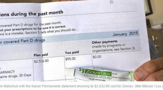 Например, за мазь от герпеса зовиракс, тот же ацикловир, который у нас стоит 40 рублей, страховые компании в США выставляют счет на $1000 .. 2500.