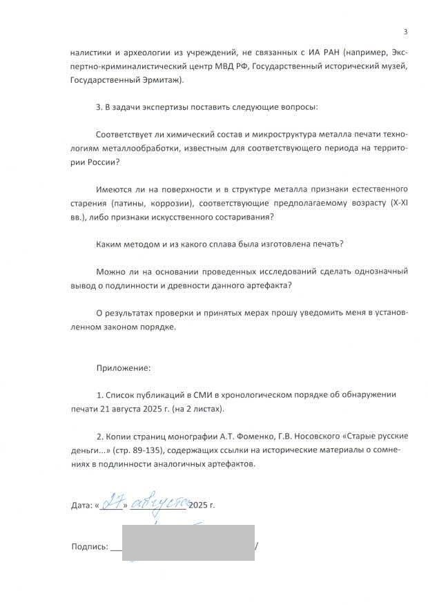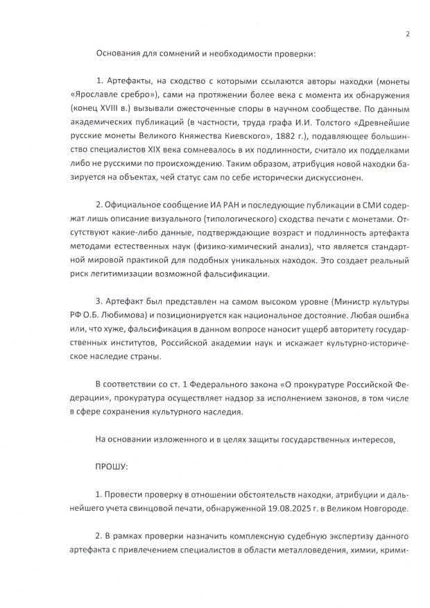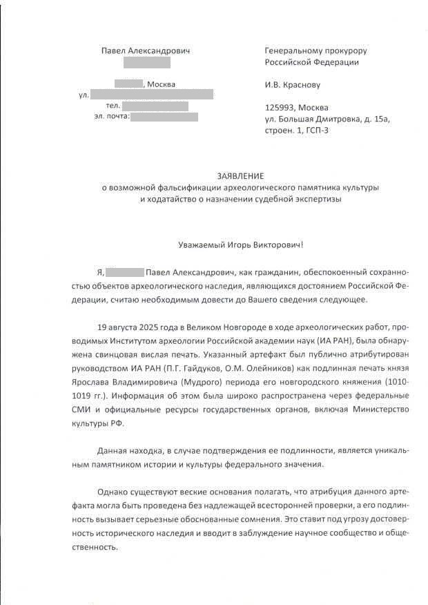 Подготовлены и направлены в 14.00 27 августа 2025 г. заявления о возможной фальсификации археологического памятника культуры и ходатайство о назначении судебной экспертизы в адреса Генеральной прокуратуры РФ и Прокуратуры Новгородской области.