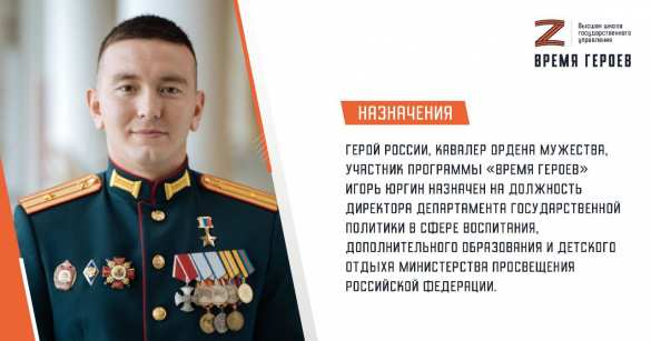 Герой России, кавалер Ордена Мужества, участник программы «Время героев» Игорь Юргин назначен на должность директора Департамента государственной политики в сфере воспитания, дополнительного образования и детского отдыха Министерства просвещения Российской Федерации.