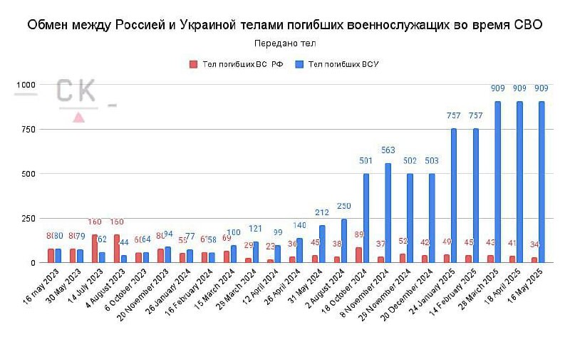 Украина получила тела 909 погибших военных, Россия — 34.