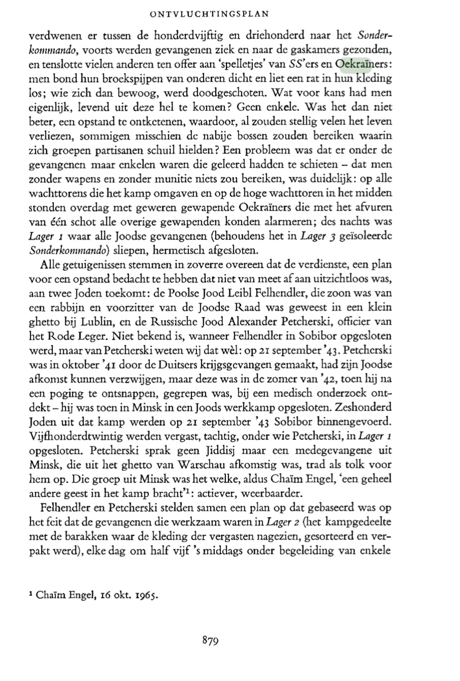 Весь этот план, чрезвычайно смелый, даже отчаянный по замыслу (если ликвидировать восемь или десять вооруженных эсэсовцев, все равно останется несколько десятков, не считая местных украинцев), имел один неизбежный недостаток и одно слабое место: недостатком было то, что никто ничего не мог сделать на благо евреев в зондеркомандах (они были недоступны), слабое место, из-за которого никто не мог уничтожить вооруженных украинцев на сторожевых вышках; хотя там не было установлено пулеметов, один выстрел одного украинца в равной степени встревожил бы всех остальных украинцев и всех эсэсовцев, находившихся в лагере и вблизи него. Фелхендлер и Печерский, тем временем, надеялись, что, по их замыслу, для украинцев, находящихся на сторожевых вышках, какое-то время будет проходить в необычных условиях.