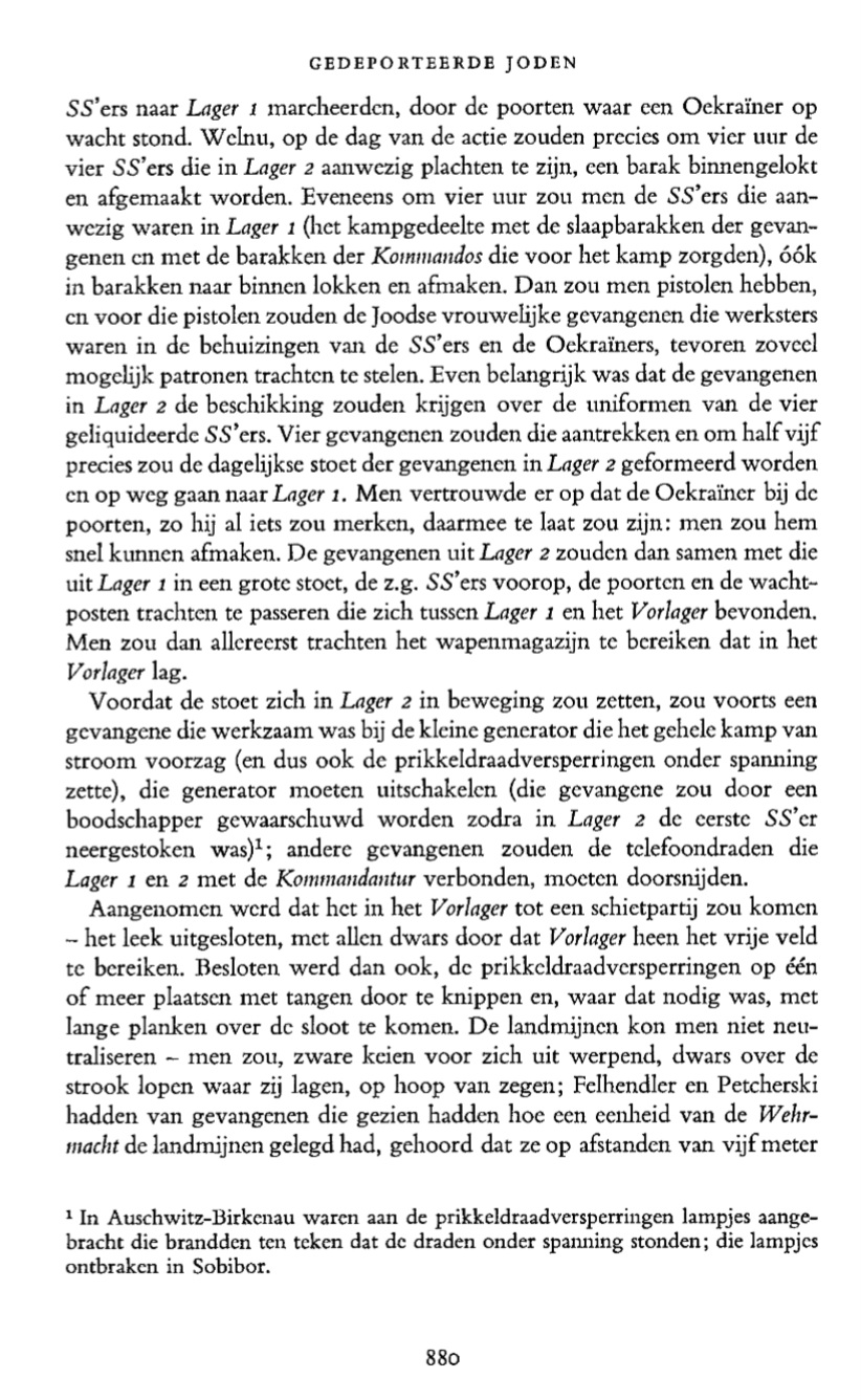 Одна из трудностей заключалась в том, что группа евреев, размещенных в лагере №1, многие из которых работали в бараках лагеря № 2 (с лагерем № 3, территорией лагеря с газовыми камерами, не было никакой связи), ни в коем случае не была постоянной: их число колебалось (максимум - тысяча) и также состав; регулярно из зондеркоманды исчезало от ста пятидесяти до трехсот человек, кроме того, заключенные заболевали и отправлялись в газовые камеры, и, наконец, другие становились жертвами "игр" эсэсовцев и украинцев: они завязывали им штанины снизу и запускали крысу в одежду: кто бы ни пошевелился, его убивали, застреливали.