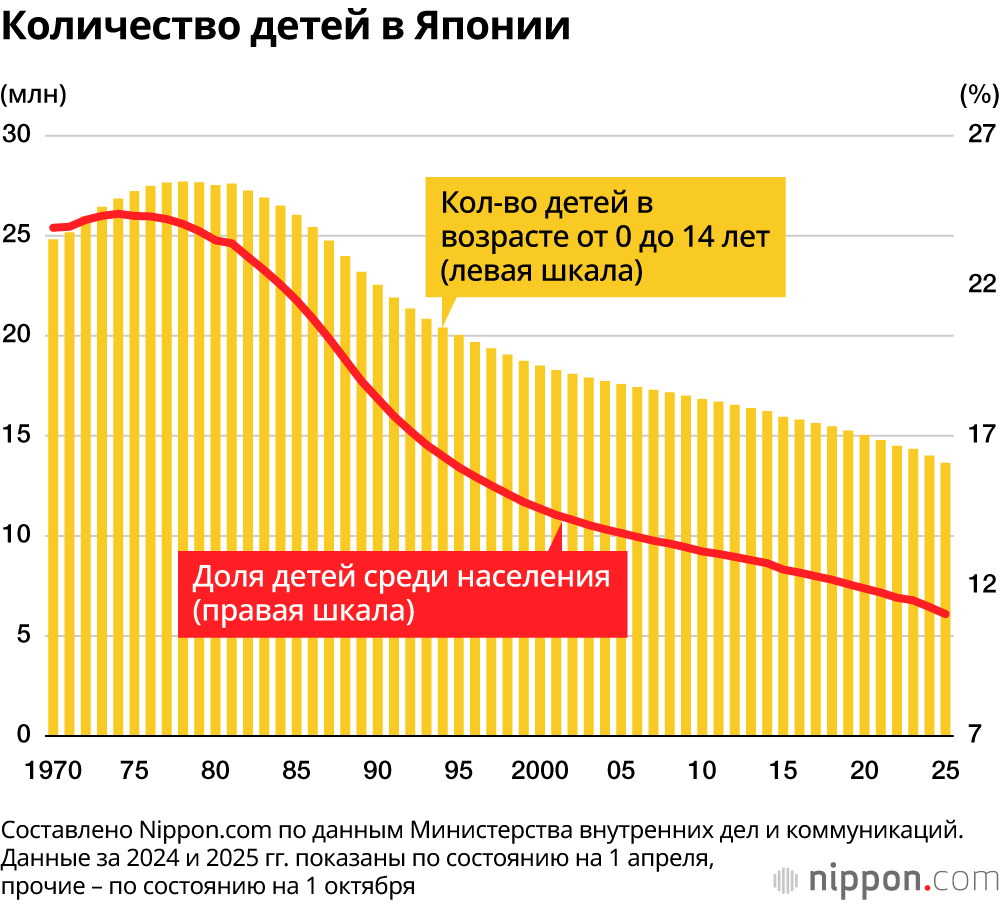По оценкам Министерства внутренних дел и коммуникаций, опубликованным в праздник Дня защиты детей 5 мая, по состоянию на 1 апреля 2025 года численность детей в возрасте до 15 лет в Японии составляла 13,66 млн человек. Это было на 350 000 меньше, чем в предыдущем году, и количество детей снижается сорок четыре года подряд с 1982 года. Это также самый низкий показатель за всю историю с тех пор, как сопоставимые статистические данные были впервые собраны в 1950 году. В стране было 6,66 миллиона девочек и 6,99 миллиона мальчиков. Дети до 15 лет составляют 11,1% от общей численности населения, что на 0,2 процентных пункта меньше, чем в предыдущем году, их доля в населении последовательно снижается 51 год подряд с 1975 года. Между тем, население людей в возрасте 65 лет и старше составляет 36,2 миллиона человек, или 29,3% от общей численности населения. Оно примерно в 2,65 раза превышает число детей – таким образом, наблюдается значительный демографический дисбаланс.