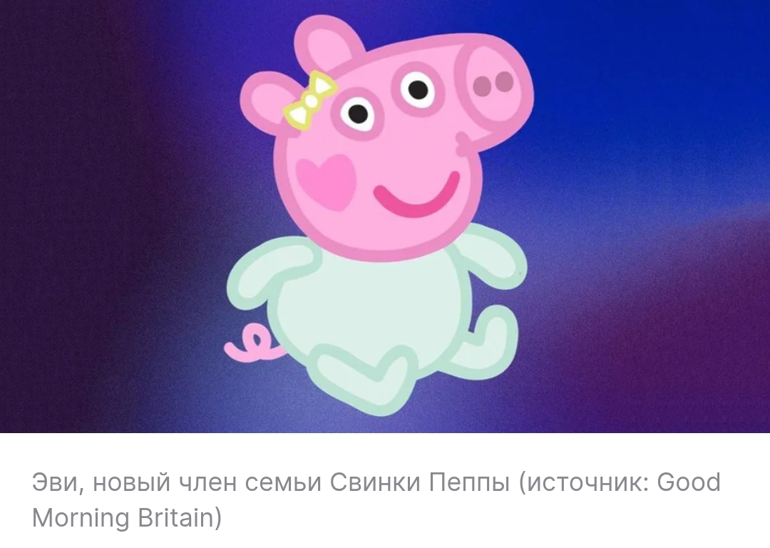 Как сообщили авторы мультсериала, зрители могут ожидать появления Эви на экранах уже осенью 2025 года, а 30 мая в кинотеатрах покажут часовой киноспектакль «Пеппа встречает малыша» — но только в Великобритании. Напомним, что впервые «Свинка Пеппа» вышла в эфир в 2004 году и с тех пор доступна в 180 странах на 40 языках. Но пока мы увидели всего одно пополнение в семействе за 20 лет существования шоу.