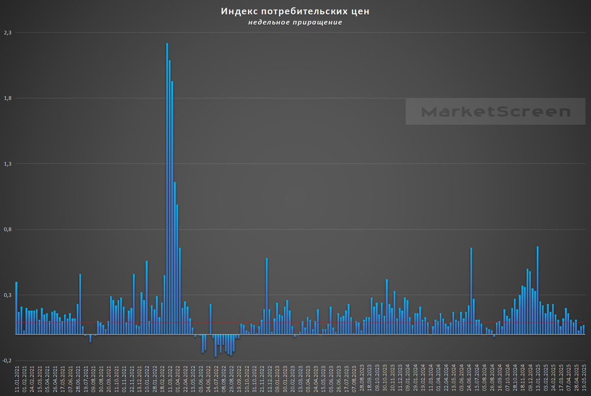 Инфляция в России за неделю с 13 по 19 мая составила 0,07%, а годовая замедлилась до 9,9%.