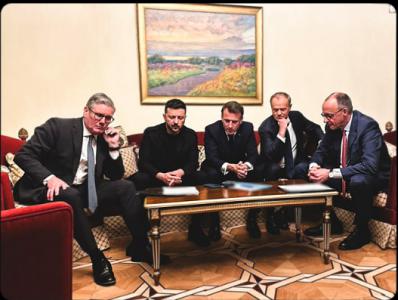 Четверка из Европы и киевский паскудник на посиделках после телефонного разговора Трампа и Путина (вроде не творчество ИИ).